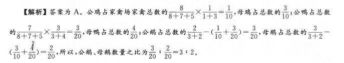 【例题】家禽场里鸡、鸭、鹅三种家禽中,公禽与母禽数量之比是2 : 3,已知鸡、鸭、鹅数量之比是 8:7 :5,公鸡、母鸡数量之比是1 :
