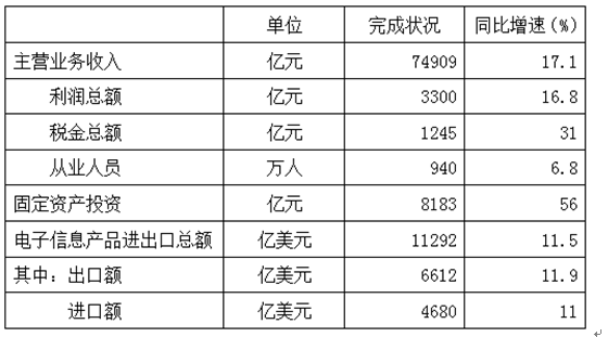 1.2011年我国规模以上电子信息制造业实现主营业务收入比上年增加约多少亿元()